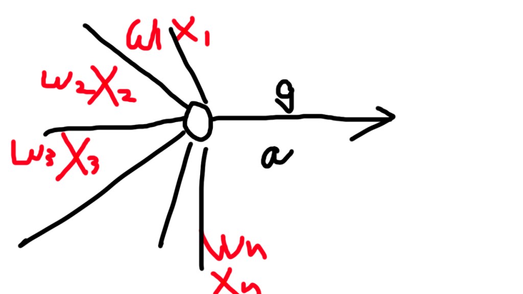で、手前のニューロンを x1, x2, x3… として、それぞれのニューロンにはそれぞれ「重みづけ」がある。x1, x2, x3…にたいしこれらを w1, w2, w3…とする