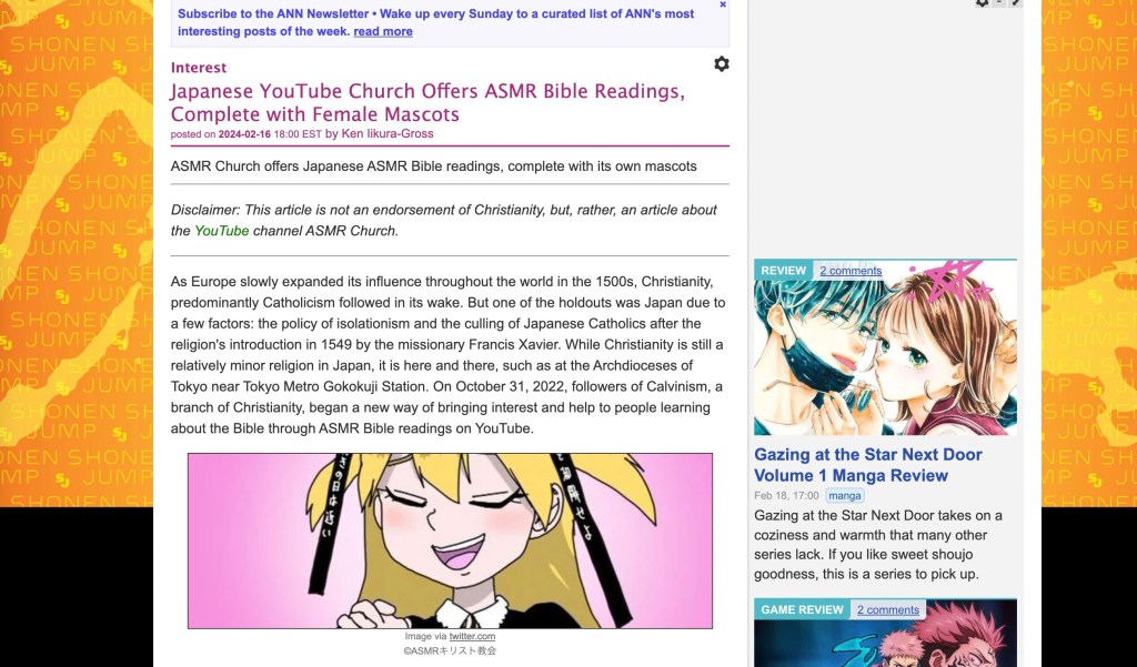 ASMRキリスト教会ですが、カナダのメディア[ANIME NEWS NETWORK]に取り上げられました。